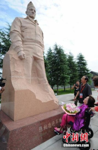 9月5日,陳納德將軍之妻陳香梅與兩位昔日的美國飛虎隊老兵來到湖南芷江飛虎隊紀念館參觀。在現(xiàn)場,陳香梅為陳納德的雕像獻上了鮮花。楊華峰 攝
