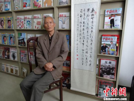 81歲的廖熙選老人展示自己的書法作品?!∪轿木?攝