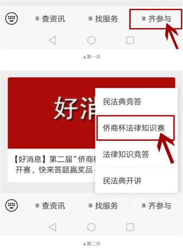 2、在手機(jī)下方點(diǎn)擊“齊參與”菜單找到“僑商杯法律知識(shí)賽”點(diǎn)擊進(jìn)入答題頁面進(jìn)行答題。