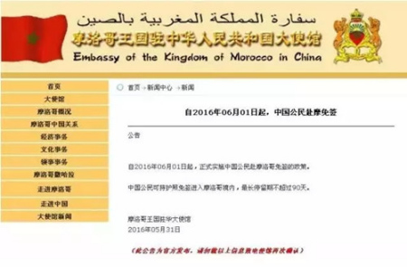 摩洛哥王國(guó)駐華大使館31日正式發(fā)布公告,自2016年06月01日起,正式實(shí)施中國(guó)公民赴摩洛哥免簽的政策。中國(guó)公民可持護(hù)照免簽進(jìn)入摩洛哥境內(nèi),最長(zhǎng)停留期不超過(guò)90天。