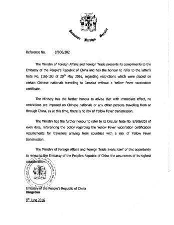 中國僑網(wǎng)7月5日電 據(jù)中國駐牙買加大使館消息,為避免中國公民前往牙買加時因無黃熱病接種證明而無法順利登機(jī)或通關(guān),請大家赴牙前將牙外交部照會打印出來,隨身攜帶。如航空公司或機(jī)場人員要求提交黃熱病接種證明,可向其出示該照會,請其放行。