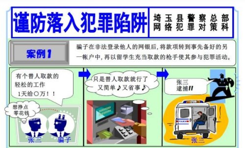 近年在網(wǎng)上商店或網(wǎng)上銀行頻頻發(fā)生犯罪團(tuán)伙的詐騙等犯罪案件,有些留學(xué)生卷入其中,警方通過分析案件,得出的結(jié)論是留學(xué)生缺乏法律知識(shí),被誘惑時(shí),認(rèn)為只是簡單的打工,又可以輕易獲得收入,導(dǎo)致直接或間接參與犯罪。