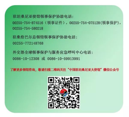 中國駐坦使館再次提醒所有在坦中國公民遵守坦法律法規(guī),循正規(guī)渠道辦理居留、工作許可等手續(xù)。