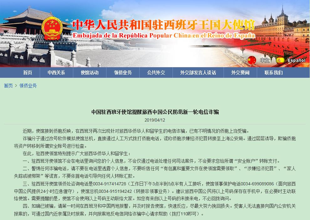中國僑網(wǎng)4月13日電 據(jù)中國駐西班牙大使館網(wǎng)站消息,近期,使館接到僑胞反映,在西班牙再次出現(xiàn)針對旅西華僑華人和留學(xué)生的電信詐騙,已有不明情況的僑胞上當(dāng)受騙。