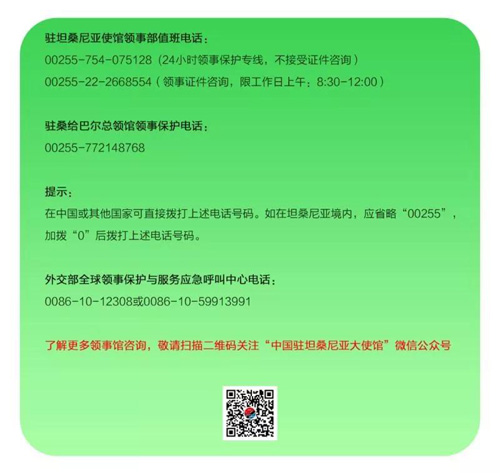 駐坦桑尼亞使館領(lǐng)事保護(hù)協(xié)助電話:00255-754075128