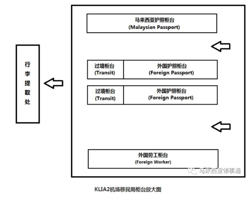 二、請根據(jù)來馬行程選擇合適的入境柜臺。如經(jīng)吉隆 坡國際機場過境前往第三國,停留不超過120小時,可經(jīng)“Transit”柜臺辦理過境簽入境;
