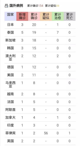 另據(jù)最新報道統(tǒng)計,國外新型冠狀肺炎累計確診病例154例,累計疑似69例。此次疫情的全球性特征越來越明顯,除中國外已有至少20個國家出現(xiàn)確診感染病例。