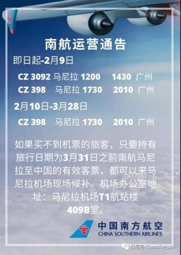 現(xiàn)提醒在菲滯留的中國(guó)旅客注意以下航班客票信息: