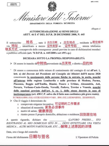 《自我聲明》下載地址: https://www.interno.gov.it/sites/default/files/allegati/modulo_autodichiarazione_10.3.2020.pdf