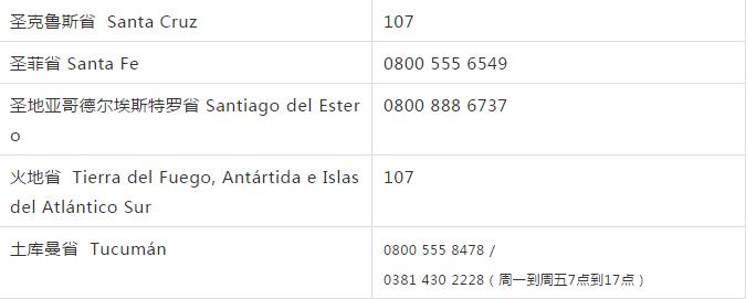 以下是阿根廷各省、市醫(yī)療急救咨詢電話信息: