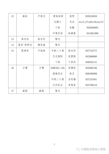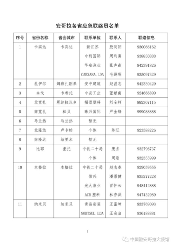 中國僑網(wǎng)4月9日電 據(jù)中國駐安哥拉大使館微信公眾號消息,當(dāng)前,安哥拉防疫形勢日趨嚴(yán)峻,國家緊急狀態(tài)短期內(nèi)仍將持續(xù)。使館協(xié)調(diào)在安僑團(tuán)在各省指定了聯(lián)絡(luò)員,進(jìn)一步完善聯(lián)防聯(lián)控機(jī)制,以集中力量、相互幫扶、攜手渡過這一特殊時(shí)期。在外省的同胞在此期間遇到緊急情況可與相關(guān)聯(lián)絡(luò)員聯(lián)系(名單附后)并通過聯(lián)絡(luò)員與使館取得聯(lián)系。暫無聯(lián)絡(luò)員的省份,歡迎僑胞踴躍向使館報(bào)名擔(dān)任相關(guān)工作。