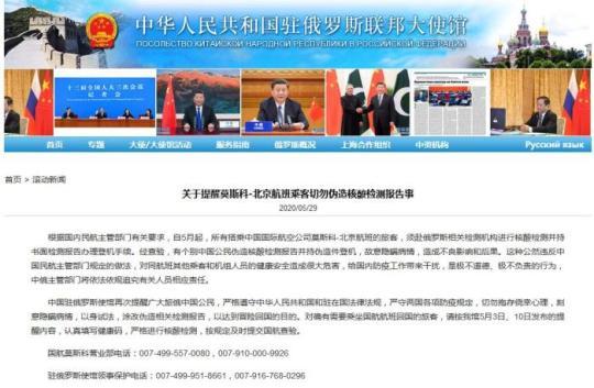 個別中國公民持偽造核酸檢測報告登機 駐俄使館提醒