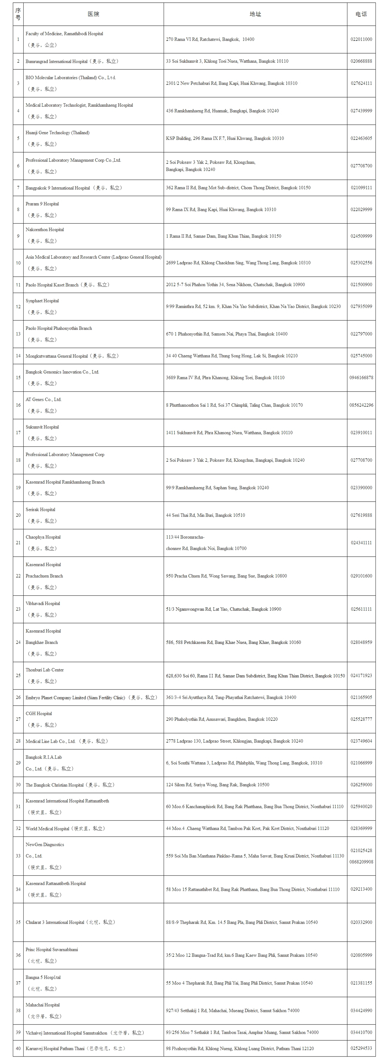 為方便赴華乘客進行新冠病毒核酸檢測,經(jīng)與泰國公共衛(wèi)生部及相關(guān)醫(yī)療機構(gòu)多方聯(lián)系確認,現(xiàn)預(yù)先公布具有新冠病毒核酸檢測資質(zhì)的醫(yī)療機構(gòu)名單。待使館發(fā)布具體實施辦法通知后,請根據(jù)相關(guān)要求做好檢測。