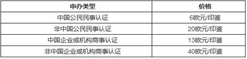 例1:中國公民認證自己的無犯罪證明,材料上有一個西外交部印鑒,則費用為6+8.5共計14.5歐元。