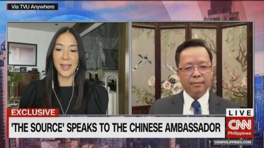 8月7日,駐菲律賓大使黃溪連應(yīng)邀參加CNN PHILIPPINES電視臺(tái)著名主持人皮尼克·韋伯(PINKY WEBB)主持的《來源》(The Source)直播連線訪談節(jié)目,就當(dāng)前中菲抗疫合作、南海問題等回答了提問。