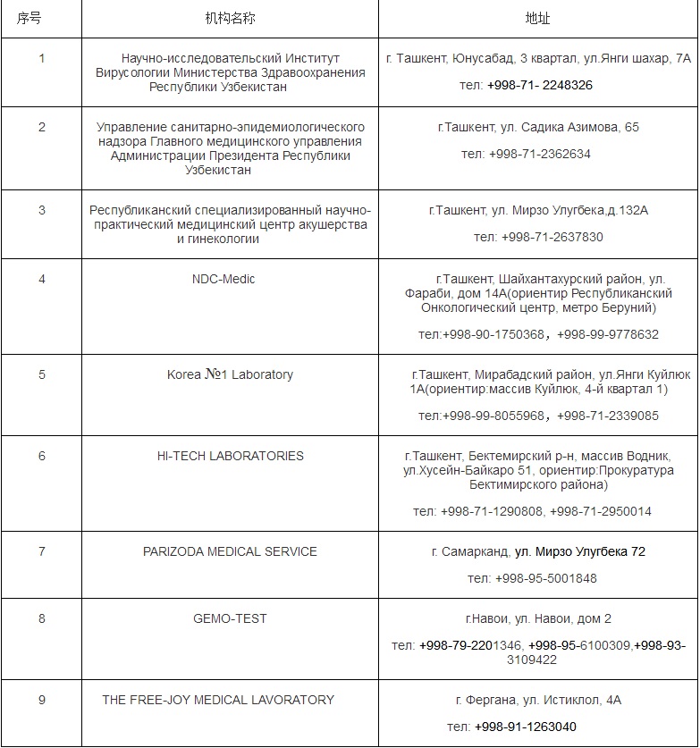 駐烏茲別克斯坦使館發(fā)布調(diào)整核酸檢測(cè)機(jī)構(gòu)名單通知