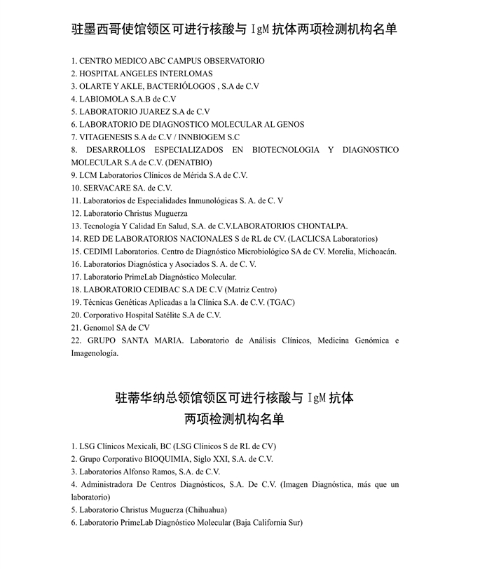 駐墨西哥使館公布具備核酸、血清抗體檢測機構(gòu)名單
