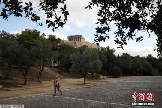 資料圖:當(dāng)?shù)貢r(shí)間11月7日,希臘雅典,一名戴口罩女子經(jīng)過帕特農(nóng)神廟。