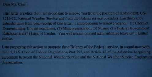 據(jù)NBC通過(guò)消息人士取得這份“辭退信”,信件由美國(guó)國(guó)家氣象局代理局長(zhǎng)勞拉·佛吉?dú)W尼(Laura Furgione)簽字, 上面的日期是2015年9月4號(hào)。