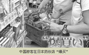 赴日本中國(guó)游客大增,再次開(kāi)啟買買買模式。而日語(yǔ)里針對(duì)中國(guó)游客出現(xiàn)了一個(gè)新詞“爆買”,網(wǎng)友發(fā)布的圖片顯示,從東京機(jī)場(chǎng)到日本街頭,到處都擠滿了中國(guó)游客。然而,這次他們不再是人手一個(gè)馬桶蓋,換之以感冒藥等物品。