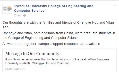 雪城校方表示,兩名學(xué)生就讀于該校工程和電腦科學(xué)學(xué)院,預(yù)計2017年畢業(yè)。另外一名受傷的學(xué)生也來自中國。