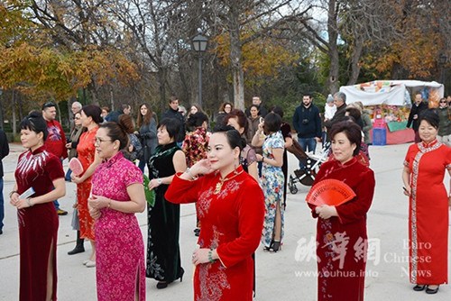 走秀過程中,40余位東方佳麗身著精美的中華傳統(tǒng)旗袍,進(jìn)行了一場(chǎng)最富有東方韻律的旗袍秀展示。跟隨馬丁先生的指揮,佳麗們口中清唱著名中國民歌《茉莉花》,伴著歌曲款款而行,一時(shí)間濃濃的東方古典風(fēng)韻在活動(dòng)現(xiàn)場(chǎng)彌漫開來,吸引了眾多西班牙友人駐足觀看。盡管初冬早晨的馬德里氣溫只有4度左右,但眾位佳麗不懼寒冷,用優(yōu)雅的步態(tài)與迷人的微笑,襯托出了中華旗袍的東方神韻。