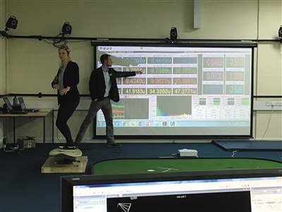班戈大學體育健康與運動科學學院的一間實驗室里學生正在模擬沖浪。