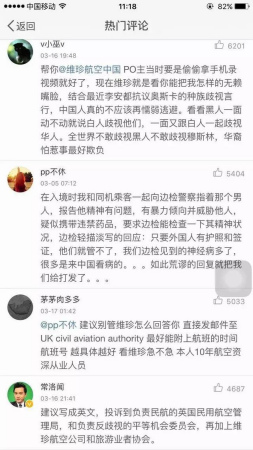 這位女乘客講述的經(jīng)歷在中國網(wǎng)民之間炸了鍋,人們對該男子的行為表示指責(zé),認為其素質(zhì)低下,種族歧視。而對于對此事件置之不理、甚至要求被罵的女子下飛機的維珍航空的空服人員,網(wǎng)友們表示:如果不查明事實、道歉,再也不坐你們的航班!