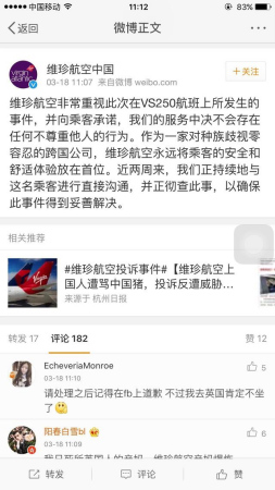 對此,維珍航空中國官方微博回復(fù)說,“我們正持續(xù)地與這名乘客進行直接溝通,并正徹查此事,以確保此事件得到妥善解決?!辈⒎Q,對侮辱行為零容忍。