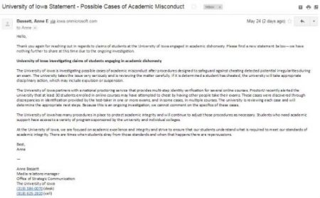 而3日后,僑報記者再次收到了來自愛荷華大學對此事件的進一步回應郵件。從郵件上看,校方確認至少30名學生涉及作弊事件(未提及是否為中國學生或者國際學生),而校方將在調查清楚后做嚴肅處理。以下是愛荷華大學郵件回應截圖以及全文翻譯: