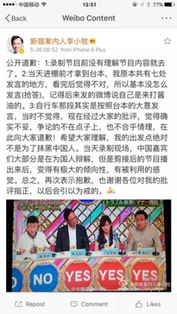 這檔節(jié)目的嘉賓之一、日籍華人李小牧事后在微博上道歉稱,當(dāng)天臨時(shí)拿到腳本,自己的一段發(fā)言按照腳本大意進(jìn)行。經(jīng)過(guò)網(wǎng)民的批評(píng)后他認(rèn)識(shí)到不妥,爭(zhēng)論的不在點(diǎn)子上,不合乎情理,有種被利用的感覺(jué)。