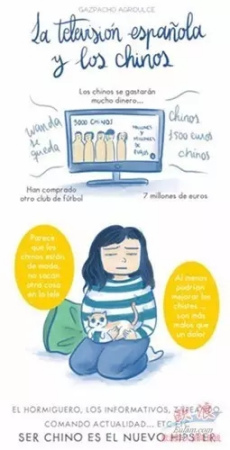 一位華裔的漫畫(huà)家在西班牙電視臺(tái)上吐槽了這次事件,用一個(gè)中國(guó)女孩的形象表達(dá)出西班牙媒體貶低中國(guó)游客形象的不滿?!翱磥?lái)中國(guó)人現(xiàn)在還挺時(shí)髦,總是上電視,但是總是圍繞一個(gè)話題在說(shuō)??墒菫槭裁催@些媒體就不能開(kāi)一個(gè)更高級(jí)點(diǎn)的玩笑呢?”