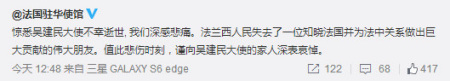 法國(guó)駐華使館悼念吳建民:法蘭西人民失去了一位知曉法國(guó)并為法中關(guān)系做出巨大貢獻(xiàn)的偉大朋友。