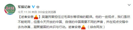 解放軍報(bào)悼念吳建民稱,中國(guó)需要不同的聲音,逝者安息。