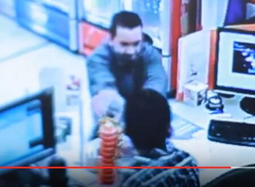Rick拿了煙在掃碼機上掃價格,并沒有注意到男子的表情動作。但事后從監(jiān)控錄像中可以看到,男子這時候已經(jīng)在演戲,只見他裝作掏錢左摸右尋。當Rick掃完一包煙正準備掃第二包時,這名男子突然出手,直接搶走香煙逃跑。