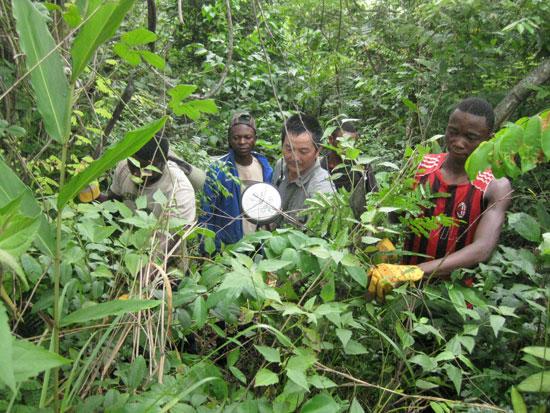 中方施工人員在馬永貝原始森林勘探中。