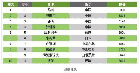 讓我們先看看2016年6月,國際乒聯(lián)公布的最新世界排名: