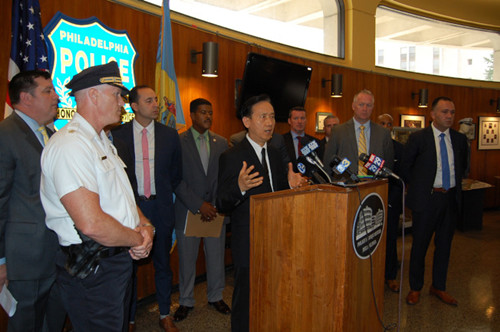 大費城華人餐館協會會長林應章在記者會上,對警方高效率破案,代表華裔小區(qū)表達敬意和謝意。