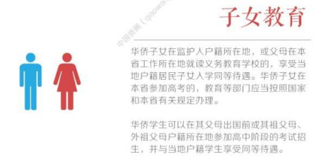 華僑子女在其監(jiān)護(hù)人戶(hù)籍所在地或者其父母在本省工作所在地就讀義務(wù)教育學(xué)校的,享受當(dāng)?shù)貞?hù)籍居民子女入學(xué)同等待遇;華僑子女在本省參加高考,教育部門(mén)等應(yīng)當(dāng)按照國(guó)家和本省有關(guān)規(guī)定辦理……