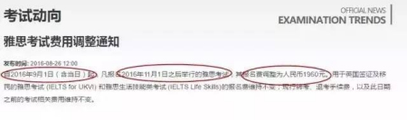 據(jù)雅思官網(wǎng)消息,自2016年9月1日起,凡報(bào)名2016年11月1日后舉行的雅思考試,報(bào)名費(fèi)調(diào)整為1960元;