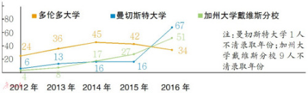從國外大學來看,隨著近年來國際學生申請數(shù)量的增長,也有兩種趨勢值得關注:一是排名處于中位(比如美國綜合性大學50名上下)的國外大學,對廣東國際高中學生的錄取人數(shù)在增長。以美國加州大學戴維斯分校(2016年《2016USNEWS》美國綜合性大學排名41)為例,在5008個樣本中,2012年錄取了4位廣東學生,2013年錄取了8位廣東學生,2014年錄取17位,2015年錄取27位,2016年錄取51位。