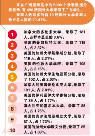 本次調查記者從上述學校獲得樣本5008個(此處指錄取人次,一個學生可能被多所國外大學錄取)。來自廣州國際高中的5008個錄取數(shù)據(jù)分析顯示,有490所國外大學錄取了廣東學生。