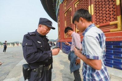 天壇公園是全國(guó)重點(diǎn)文物保護(hù)單位,國(guó)家5A級(jí)旅游景區(qū),每年的節(jié)假日迎來全國(guó)各地的游客,國(guó)慶節(jié)當(dāng)天,天壇公園接待了5萬多人次的游客。為了保證游客游園的安全,每一個(gè)節(jié)假日,天壇公園派出所的民警都堅(jiān)守在一線崗位,沒有休過一個(gè)完整的假期。