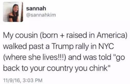 “我表弟生長在美國,他經(jīng)過紐約反特朗普游行隊伍時,被罵‘滾回你的國家,中國佬!’”