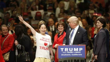 這張照片曾發(fā)表在《洛杉磯時報》,今年5月特朗普在橙縣安納漢姆演講時,鄭玲(音譯)在特朗普旁邊揮舞雙手支持他。