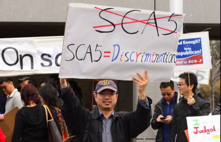 教育平權法案(affirmative action),尤其是在加州由民主黨主導通過的SCA5法案。亞裔普遍重視教育,在學業(yè)表現(xiàn)上優(yōu)于非裔和拉丁裔等其他少數(shù)族裔,然而民主黨主張的平權法案卻可能剝奪一部分亞裔受教育的機會,因此引發(fā)亞裔不滿。