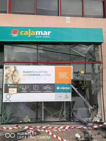 中國(guó)僑網(wǎng)11月22日電 據(jù)西班牙《歐華報(bào)》報(bào)道,11月21日凌晨,西班牙馬拉加幾名劫匪搶劫了位于華人批發(fā)區(qū)的Cajamar銀行,歹徒利用爆炸物將其大門炸毀,用重型起重設(shè)備將自動(dòng)取款機(jī)抬走。造成銀行大門被全部損壞,玻璃和辦公設(shè)備全被震碎。因事發(fā)在凌晨,目前暫無(wú)人員傷亡。據(jù)銀行相關(guān)人員透露,銀行正在清點(diǎn)損失。