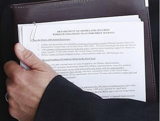 堪薩斯州務卿柯巴奇11月20日會見特朗普時,手中的文件意外泄露了他對付無證移民的強硬計劃。