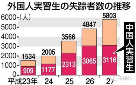 也就是說(shuō),從2011年開始的5年間,已經(jīng)有1萬(wàn)余名中國(guó)技能實(shí)習(xí)生失蹤。