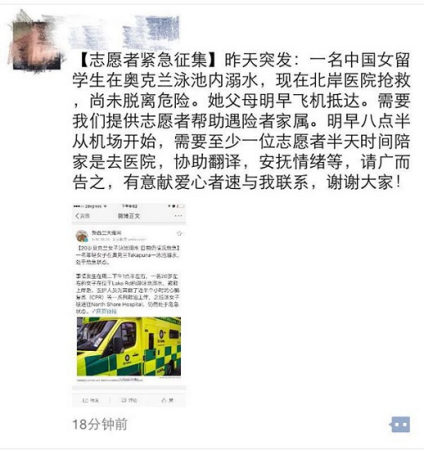 中國僑網(wǎng)1月12日電 據(jù)新西蘭天維網(wǎng)報道,當?shù)貢r間11日晚,新西蘭奧克蘭華人朋友圈一條消息牽動了無數(shù)網(wǎng)友的心:一名中國女留學生在北岸Takapuna一泳池內(nèi)溺水,正在搶救。